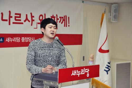 새누리당 김성용 미래세대위원장이 지난 18일 서울 여의도 당사에서 열린 청년 서포터즈 '청춘나르샤'의 발대식 현장에서 인사말을 전하고 있다. 사진/새누리당 청년국
