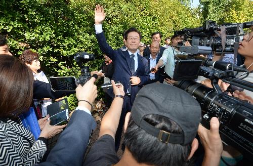 이재명 성남시장이 공직선거법 위반 혐의에 대한 조사를 받기 위해 지난 4일 오전 경기도 성남시 수정구 수원지방검찰청 성남지청으로 출석하며 지지자들을 향해 손인사를 하고 있다. 사진/뉴스1