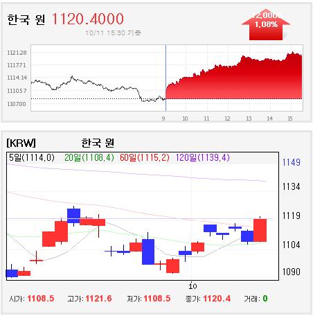 11일 서울 외환시장에서 원·달러 환율은 전 거래일보다 0.1원 오른 1108.5원에 거래를 시작해 12.0원 오른 1120.4원에 거래를 마쳤다.