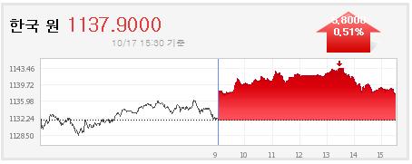 17일 서울 외환시장에서 원·달러 환율은 전 거래일보다 8.1원 오른 1140.2원에 거래를 시작해 5.8원 오른 1137.9원에 거래를 마감했다.