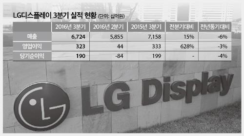 LG디스플레이는 26일 3분기 매출액 6조7238억원, 영입이익 3232억원을 기록했다고 공시했다. 전년 동기 대비 각각 6.1%, 2.9% 감소했지만, 전분기 대비해서는 매출액은 14.8%, 영업이익은 628% 크게 개선됐다. 당기순이익도 1896억원을 기록, 전분기 적자에서 탈출했다. 경쟁심화와 환율하락 속에서도 대형 LCD 패널 가격의 상승과 함께 UHD, IPS 등 차별화 제품의 비중이 증가하며 부진 탈출을 도왔다.