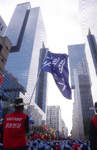 삼성전자 임시 주주총회가 열린 지난달 27일 서울 서초동 삼성전자 서초사옥 앞에서 프린팅솔루션사업부 근로자들이 집회를 하고 있다. 사진/뉴시스