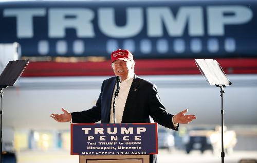미 공화당 대선후보 도널드 트럼프가 6일 미니애폴리스 국제공항 유세장에서 연설하고 있다. 사진/뉴시스