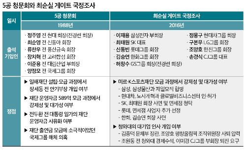 6일 국회에서 열린 청문회에는 허창수 전국경제인연합회 회장(GS 회장)을 비롯해 이재용 삼성전자 부회장, 정몽구 현대차 회장, 최태원 SK 대표, 구본무 LG 회장, 신동빈 롯데 회장, 조양호 한진 회장, 김승연 한화 회장, 손경식 CJ 회장 등 9명의 재벌 총수가 출석했다. 이들을 국회로 불러들인 동인은 성난 촛불민심이었다.