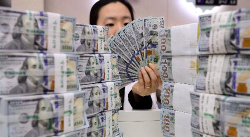 미국 금리인상으로 달러 가치가 14년만에 최고치를 경신한 15일 오후 서울 중구 KEB하나은행 본점에서 직원이 달러를 정리하고 있다.사진/뉴시스
