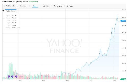 최초 상장 당시 1.50에 불과했던 아마존의 주가는 현재 766.25를 나타내고 있다. 10년이 채 되지 않은 시기동안 약 500배의 주가가 성장한 것이다.