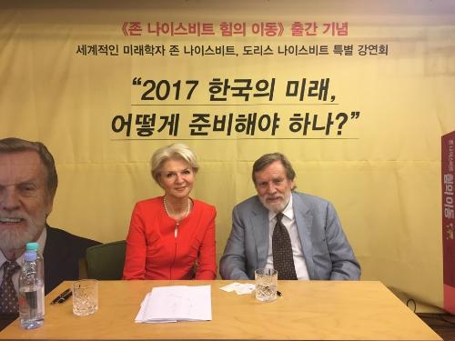 지난 15일 서울 종로구 마이크임팩트스퀘어 12층 대강의실에서는 미래학자 존 나이스비트와 그의 부인 도리스 나이스비트가 공동 집필한 ‘힘의 이동’ 출간 기념 강연회가 열렸다. 깔끔한 정장 차림으로 나온 나이스비트 부부는 자신들의 저서에 담긴 핵심 내용들을 요약하면서 향후 한국이 나아가야 할 방향도 제시했다.