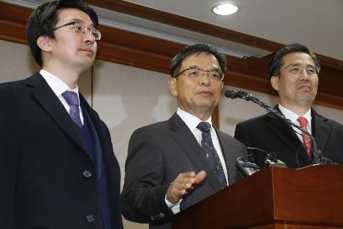 이중환 변호사(가운데) 등 박근혜 대통령 대리인단이 지난 16일 오후 서울 종로구 재동 헌법재판소에서 탄핵심판 의견서를 제출한 뒤 브리핑실을 찾아 기자들의 질문에 답하고 있다. 사진/뉴시스