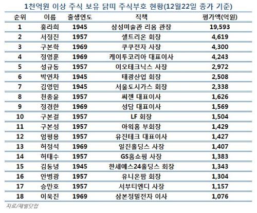 [뉴스토마토 이재영기자] '닭띠' 주식부호 1위에 홍라희 삼성리움미술관장이 이름을 올렸다. 평가액만 2조원대에 육박하는 것으로 조사됐다. 재벌닷컴은 25일 지난 22일 종가 기준으로 1억원 이상의 주식(상장 및 비상장)을 보유한 닭띠 주주 633명의 자산 현황을 집계, 발표했다. 100억원 이상 주식 보유자는 189명, 1000억원 이상은 18명이다.