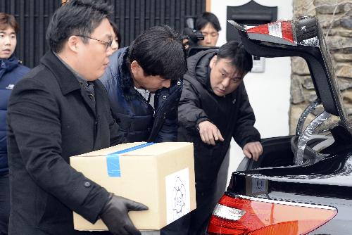 최순실 등의 국정농단사건을 수사 중인 박영수 특별검사팀이 26일 오전 서울 종로구 김기춘 전 청와대 비서실장 자택 압수수색을 마친 뒤 압수품을 옮기고 있다. 사진/뉴시스
