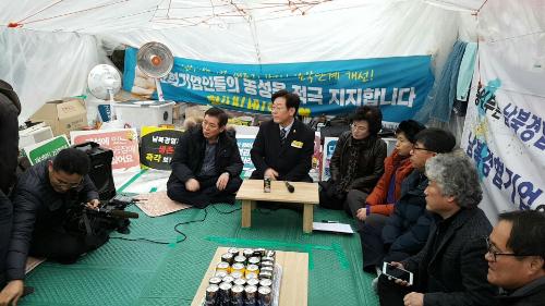 이날 이 시장을 만난 유동호 비대위원장은 "정부의 폭력에 의해 삶을 담보로 90일째 돌바닥에 있다"며 "많은 대선주자들이 좋은 말씀 많이 하지만 정말로 국민들의 삶, 분노하는 사람들의 애환을 보듬지 못한다"고 말했다.