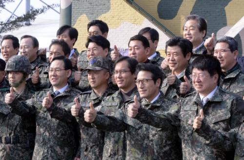 개혁보수신당 정병국 창당준비위원장과 주호영 원내대표 등 소속 의원들이 2일 오후 경기 파주 1사단 내 도라전망대를 방문해 시무식을 가진 뒤 기념사진을 찍고 있다. 사진/뉴시스