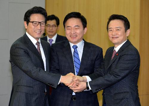4일 오전 서울 여의도 국회 의원회관에서 새누리당 탈당 기자회견 마친 원희룡(가운데) 제주도지사가 개혁보수신당(가칭) 정병국(왼쪽) 창당준비위원장, 남경필 경기도지사와 함께 인사를 나누고 있다. 사진/뉴시스