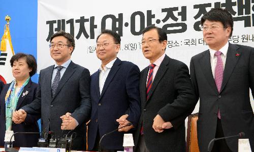 8일 오후 국회 더불어민주당 원내대표실에서 열린 제1차 여야정 정책협의회에 참석자들이 회의 시작 전 포즈를 취하고 있다. 왼쪽부터 국민의당 조배숙 정책위의장, 더불어민주당 윤호중 정책위의장, 유일호 경제부총리 겸 기획재정부 장관, 새누리당 이현재 정책위의장, 바른정당 이종구 정책위의장. 사진/뉴시스