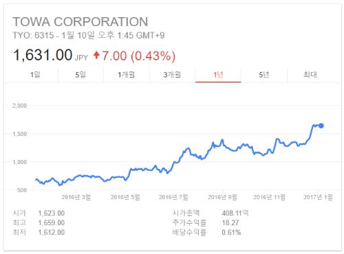 지난해 말 기준 토와 주가는 주당 1647엔이다. 지난 한 해 주가 상승률은 100%를 넘었다. 시가총액은 410억엔.