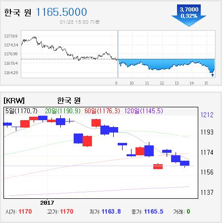 23일 서울 외환시장에서 원·달러 환율은 전 거래일보다. 0.8원 오른 1170.0원에 거래를 시작해, 3.7원 내린 1165.5원에 거래를 마쳤다.