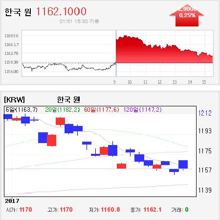 31일 서울 외환시장에서 원·달러 환율은 전 거래일보다 10.8원 오른 1170.0원에 거래를 시작해, 2.9원 오른 1162.1원에 거래를 마쳤다.