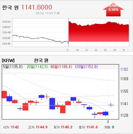 2일 서울 외환시장에서 원·달러 환율은 전 거래일보다 11.3원 오른 1142.0원에 거래를 시작해, 전 거래일보다 10.9원 오른 1141.6원에 거래를 마쳤다.
