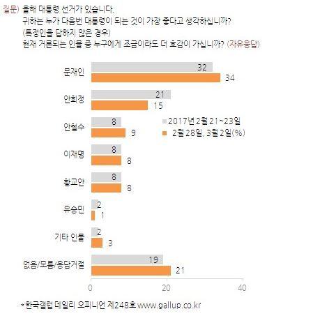 국민의당 안철수 전 대표는 1%p 상승한 9%를 기록했고, 이재명 성남시장과 황교안 대통령 권한대행은 각각 8%로 변동이 없었다. 바른정당 유승민 의원은 1%를 기록해 지난주 2%에서 반 토막이 났다.