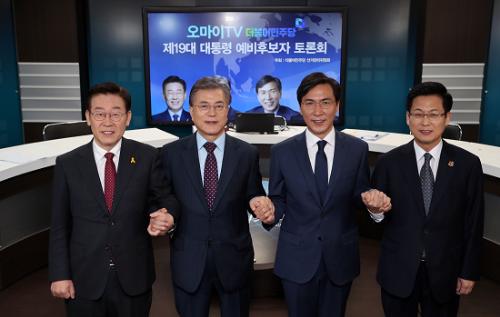 6일 오전 서울 마포구 상암동 ‘오마이 티비’ 스튜디오에서 열린 더불어민주당 대선경선 예비후보자 토론회에 참석한 이재명(왼쪽부터) 성남시장, 문재인 전 대표, 안희정 충남지사, 최성 고양시장이 토론에 앞서 포토타임을 갖고 있다. 사진/뉴시스