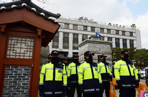 박근혜 대통령 탄핵심판 선고를 하루 앞둔 9일 오후 서울 종로구 헌법재판소 앞에서 경찰이 경계근무를 강화하고 있다. 사진/뉴시스