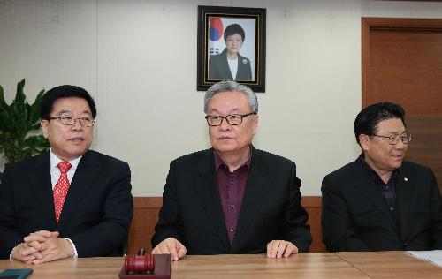 자유한국당 인명진(가운데) 비상대책위원장 등 의원들이 12일 여의도 당사에서 열린 비상대책위원회 회의에 참석해 자리하고 있다. 사진/뉴시스