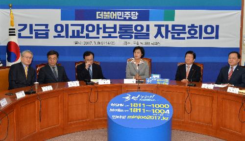 지난 8일 서울 여의도 국회 더불어민주당 당 대표 회의실에서 열린 긴급 외교안보통일 자문회의에 참석한 추미애(왼쪽 네번째) 대표 등이 사드 배치와 중국 경제 보복 등에 대해 논의하고 있다. 사진/뉴시스