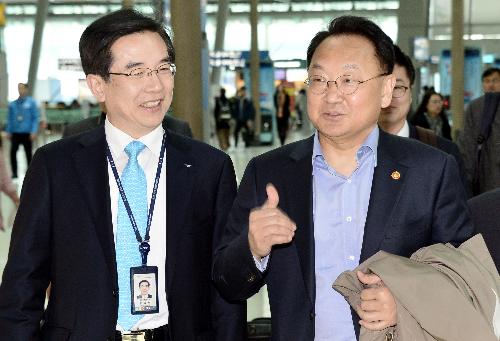 유일호 경제부총리 겸 기획재정부 장관이 지난 15일 G20재무장관·중앙은행총재 회의 참석을 위해 인천국제공항에서 출국하고 있다. 사진/뉴시스