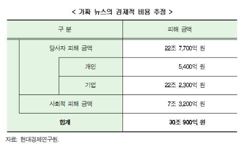 가짜뉴스 피해 당사자가 연예인·운동선수, 정치인, 일반인 등 개인이고 피해 발생 기간이 약 한달동안 이어지면 이들의 1개월 평균 소득을 토대로 한 피해금액은 연5400억원으로 추산됐다.