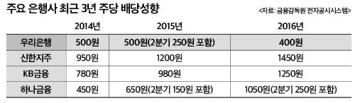 1주당 400원의 배당은 지난해(1주당 500원)보다 낮다. 현금배당액 역시 전년 대비 20% 하락한 2693억원에 그쳤다. 앞서 우리은행은 흑자전환을 한 지난 2014년부터 매년 배당을 해왔다. 2014년에는 1주당 500원의 배당을 책정했다. 2015년에는 2분기(250원) 4분기(250원) 두 번에 걸쳐 총 1주당 500원의 배당을 결정했다.