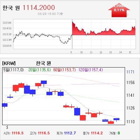 29일 서울 외환시장에서 원·달러 환율은 전 거래일보다 3.5원 오른 1116.5원에 거래를 시작해 1.2원 오른 1114.2원에 거래를 마쳤다.