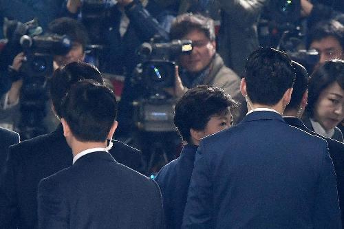 오전 10시9분 박 전 대통령이 모습을 드러냈다. 그는 윤상현, 박대출 자유한국당 의원 등 친박 인사들을 먼저 내보낸 뒤 사저를 나섰다. 웃는 듯 마는 듯 어색한 표정으로 측근에게 눈인사를 건넸지만 검은색 에쿠스 차량에 올라탈 때 표정은 굳어 있었다. 지지자들도 박 전 대통령이 타고 있는 승용차가 큰길 쪽으로 미끄러져 나가자 크게 동요했다. 개중에는 통곡하는 사람과 도로를 막으려 시도하는 사람도 있었다.