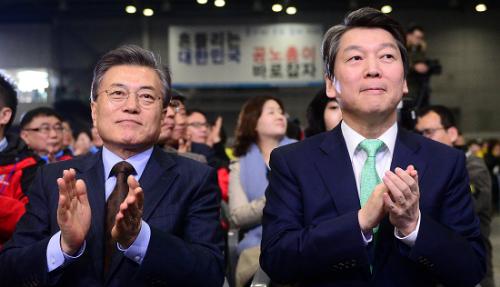 더불어민주당 문재인 후보와 국민의당 안철수 후보가 지난 3월18일 오후 경기 고양 일산 킨텍스에서 열린 공무원노동조합총연맹 제4대 출범식에 박수를 치고 있다. 사진/뉴시스
