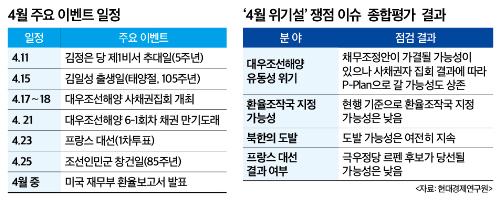 연구원이 본 4월 위기설의 원인은 대우조선해양 유동성 위기와 환율조작국 지정 가능성, 북한의 도발, 프랑스 선거 일정에 따른 유로존 리스크다. 이들의 쟁점 요소들이 현실화 되면 국내외 금융시장 불확실성 확대는 물로 실물 경제의 타격이 불가피하다.