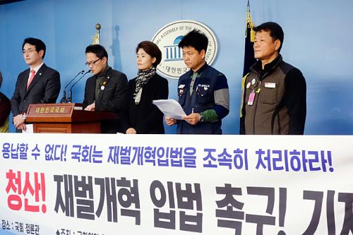 지난 2월21일 금속노조가 국회에서 기자회견을 열고 재벌개혁 입법안을 요구했다. 사진/금속노조