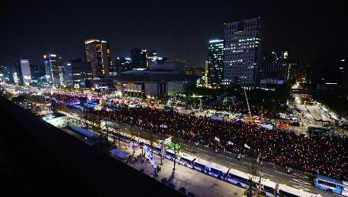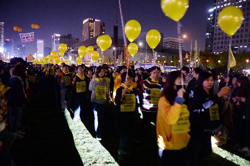 15일 서울 종로구 광화문 광장에서 열린 '세월호 참사 3년 4월16일의 약속, 함께 여는 봄' 집회에서 시민들이 촛불을 들고 있다. 사진/뉴시스