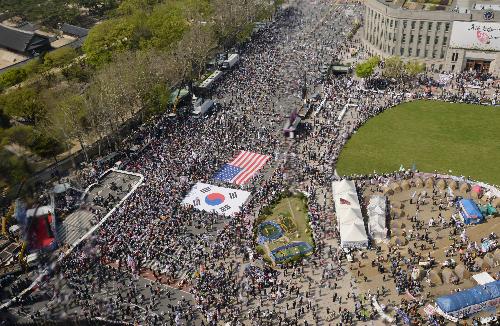 '박근혜정권퇴진 비상국민행동'(퇴진행동)가 이날 오후 서울 광화문 광장에서 주최한 ‘세월호 참사 3년 4월16일의 약속, 함께 여는 봄’ 행사에는 시민 총 10만명(주최 측 추산)이 모여 시종일관 경건하고 숙연한 분위기에서 집회에 참여했다.