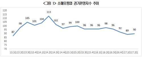 대한상공회의소는 17일 서울과 6대 광역시의 1000여개 소매 유통업체들을 대상으로 '2017년 2분기 소매유통업 경기전망지수(RBSI: Retail Business Survey Index)' 조사를 실시한 결과, RBSI는 90으로 집계됐다고 밝혔다. 전분기보다 1포인트 올랐지만, 2015년 2분기 이후 8분기 연속 기준치(100)를 하회했다. RBSI는 유통업체들이 체감하는 경기를 수치화한 선행지표로, 100을 기준으로 지수가 이를 상회하면 다음 분기 경기가 호전될 것으로 예상하는 기업이 더 많다는 의미다.