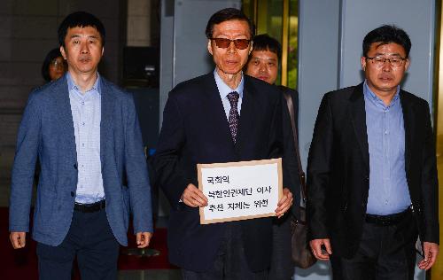 김태훈(가운데) 한반도인권과통일을위한변호사모임(한변) 상임대표가 북한인권재단 출범 방해행위에 대한 헌법소원을 제기하기 위해 지난달 18일 서울 종로구 헌법재판소로 향하고 있다. 사진/뉴시스