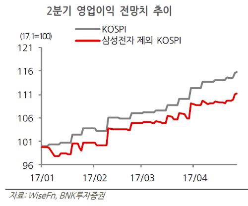 삼성전자를 제외한 2분기 영업이익 전망치 추이. 사진/BNK투자증권