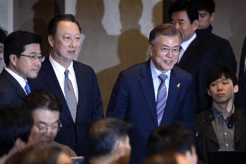 문재인(오른쪽 두번째) 19대 대통령 당선자가 지난달 14일 서울 중구 한국프레스센터에서 열린 '대한상공회의소 초청 강연'에서 박용만(왼쪽 두번째) 대한상의 회장과 함께 참석하고 있다. 사진/뉴시스
