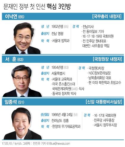 [뉴스토마토 한고은 기자] 문재인 대통령이 이낙연 전남도지사와 서훈 전 국가정보원 3차장을 새 정부 초대 국무총리와 국정원장으로 지명했다. 문 대통령은 첫 인선 배경에 대해 "선거 기간 중 새 정부 첫 총리로 대탕평, 통합형, 화합형 인사를 임명하겠다고 약속 한 바 있다"며 "탕평인사의 신호탄이 될 것으로 기대한다"고 설명했다.
