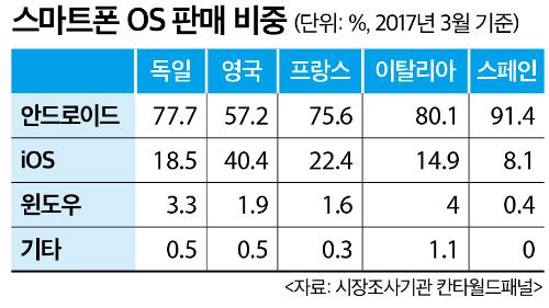 운영체제(OS)로 보면, 1분기 EU5 국가에서 안드로이드 점유율은 76.3%로 지난해 같은 기간보다 0.7%포인트 증가했다. 애플의 iOS는 전년 동기 대비 1.9%포인트 오른 20.7%를 기록했다. iOS 점유율은 특히 영국에서 두드러졌다. 1년 전보다 5.6%포인트 증가한 40.4%로, 다른 EU5 국가들보다 2~3배가량 높았다.