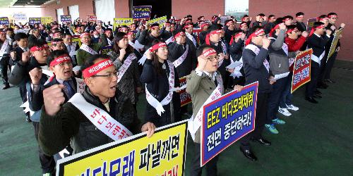 전남 여수수협에 모인 어민 200여 명이 정부의 남해 배타적경제수역(EEZ) 바닷모래 채취 기간 연장 조치에 반발하는 집회를 갖고 있다. 사진/뉴시스