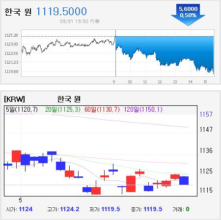 31일 서울 외환시장에서 원·달러 환율은 전 거래일보다 1.1원 내린 1124.0원에 거래를 시작해, 전 거래일보다 5.6원 내린 1119.5원에 거래를 마쳤다. 지난 25일 이후 4거래일 만에 1110원대에 진입했다.
