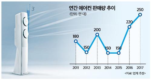 2014년 세월호 참사와 2015년 메르스 여파로 150만대 수준으로 떨어졌던 국내 에어컨 판매량은 지난해 기록적인 더위로 220만대를 기록, 큰 폭의 반등에 성공했다. 예상치를 상회하는 수요가 발생하면서 극심한 품귀현상을 빚을 정도로 에어컨이 동이 났다.