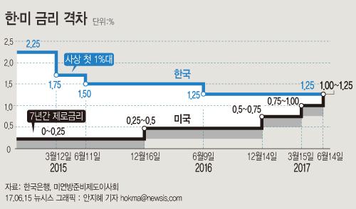 우리나라 기준금리(연1.25%)가 미 기준금리 상단과 같아지면서 한은 기준금리 인상 속도가 빨라질 것이라는 전망도 나오고 있다. 현재 한은의 동결기조가 이어지고 미 연준이 빠르면 9월 추가금리인상에 나설 경우 한미 간 금리가 역전되면서 자본유출 우려에 대한 경계감이 커지기 때문이다.