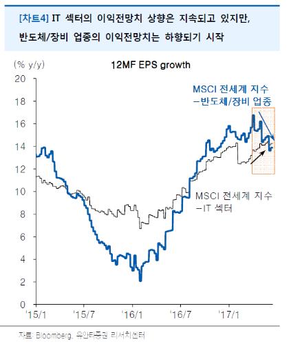 미 기술주 상승의 주 배경은 4차 산업혁명에 대한 기대감이었고 국내증시에서도 IT주들의 강세가 거의 1년 가까이 시장을 이끌어 왔다. 문제는 반도체·장비업종의 주당순이익(EPS) 성장치가 하향되기 시작했다는 것이다. 즉 단기적으로 실적의 정점을 찍었을 가능성이 높다. 국내업체들 역시 2분기 실적이 정점이 될 수 있다는 점에서 나스닥과 국내 삼성전자, 하이닉스 중심의 반도체장비관련 코스닥의 동반 약세를 주의해야 한다.