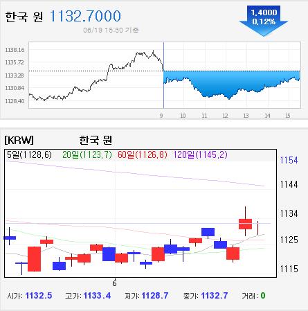19일 서울 외환시장에서 원·달러 환율은 전 거래일 보다 1.6원 내린 1132.5원에 거래를 시작해, 전 거래일보다 1.4원 내린 1132.7원에 거래를 마쳤다.