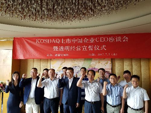 '중국기업 CEO 간담회 및 투명경영 선포식'은 그동안 상장 중국기업에 대해 지속적으로 제기됐던 투자자의 불신 및 차이나 디스카운트 해소방안 논의를 위해 마련됐다. 코스닥에 상장한 중국기업 14개 중 12개사 대표가 참석했다.